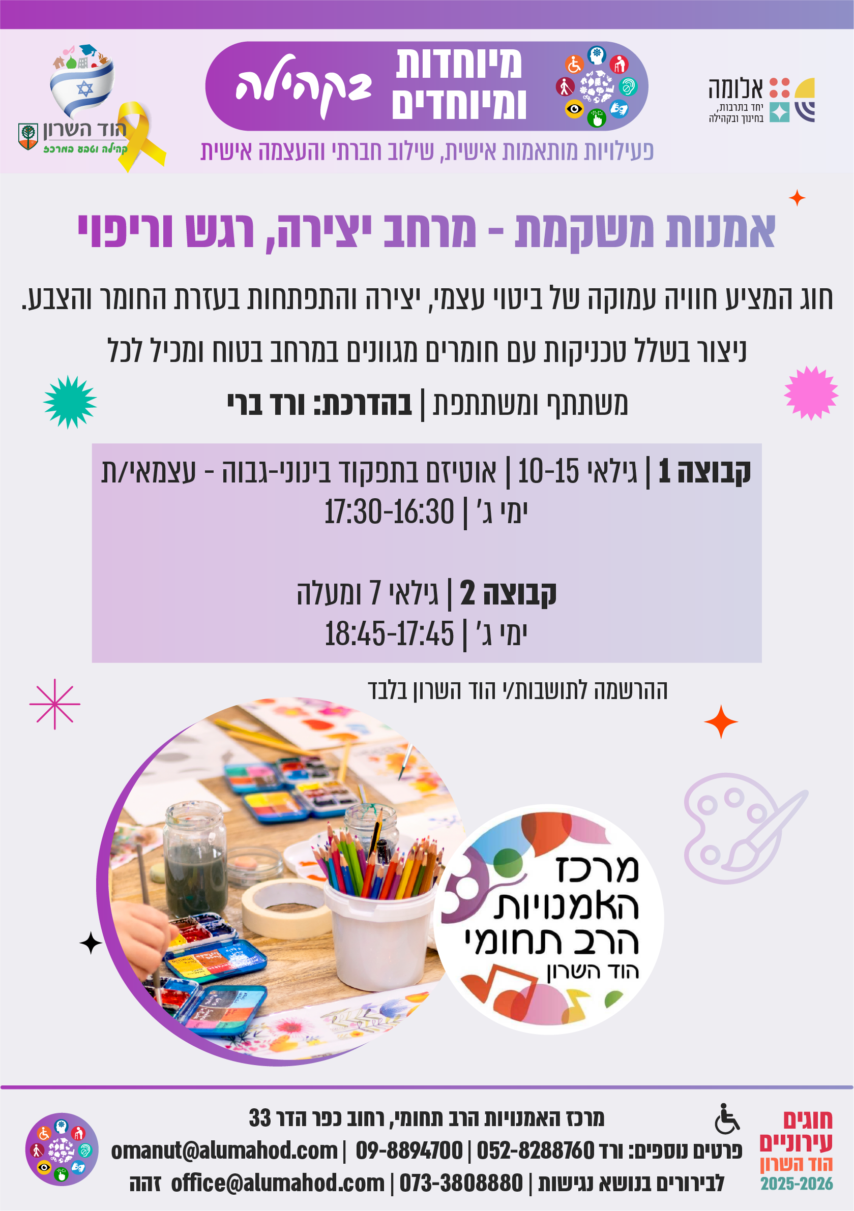 לפרטים נוספים: ורד 052-8288760 | 09-8894700 | omanut@alumahod.com yaelb@hod- hasharon.muni.il