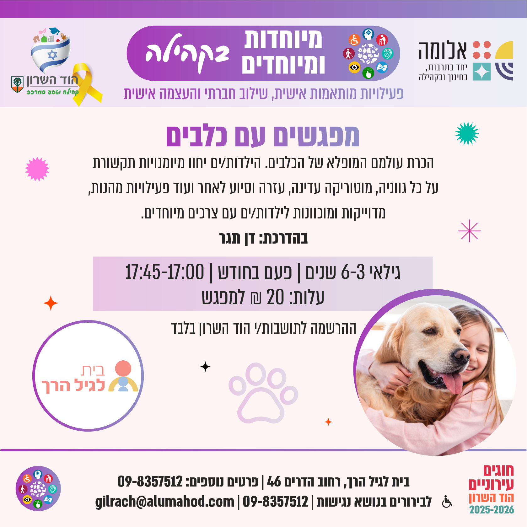 הכרת עולמם המופלא של הכלבים. הילדות/ים יחוו מיומנויות תקשורת על כל גווניה, מוטוריקה עדינה, עזרה וסיוע לאחר ועוד פעילויות מהנות, מדויקות ומוכוונות לילדות/ים עם צרכים מיוחדים.