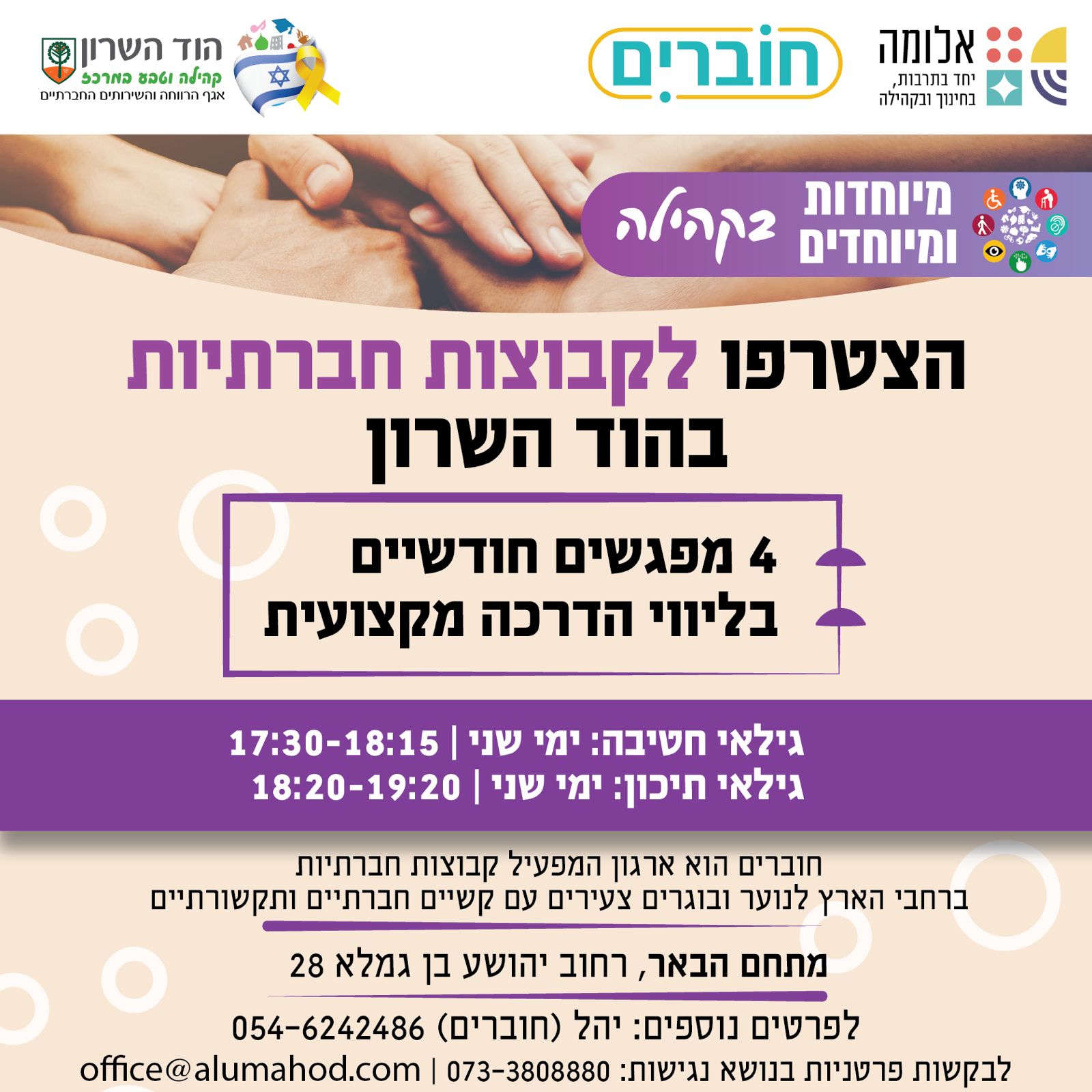 הצטרפו לקבוצות חברתיות בהוד השרון – 4 מפגשים חודשיים בליווי הדרכה מקצועית