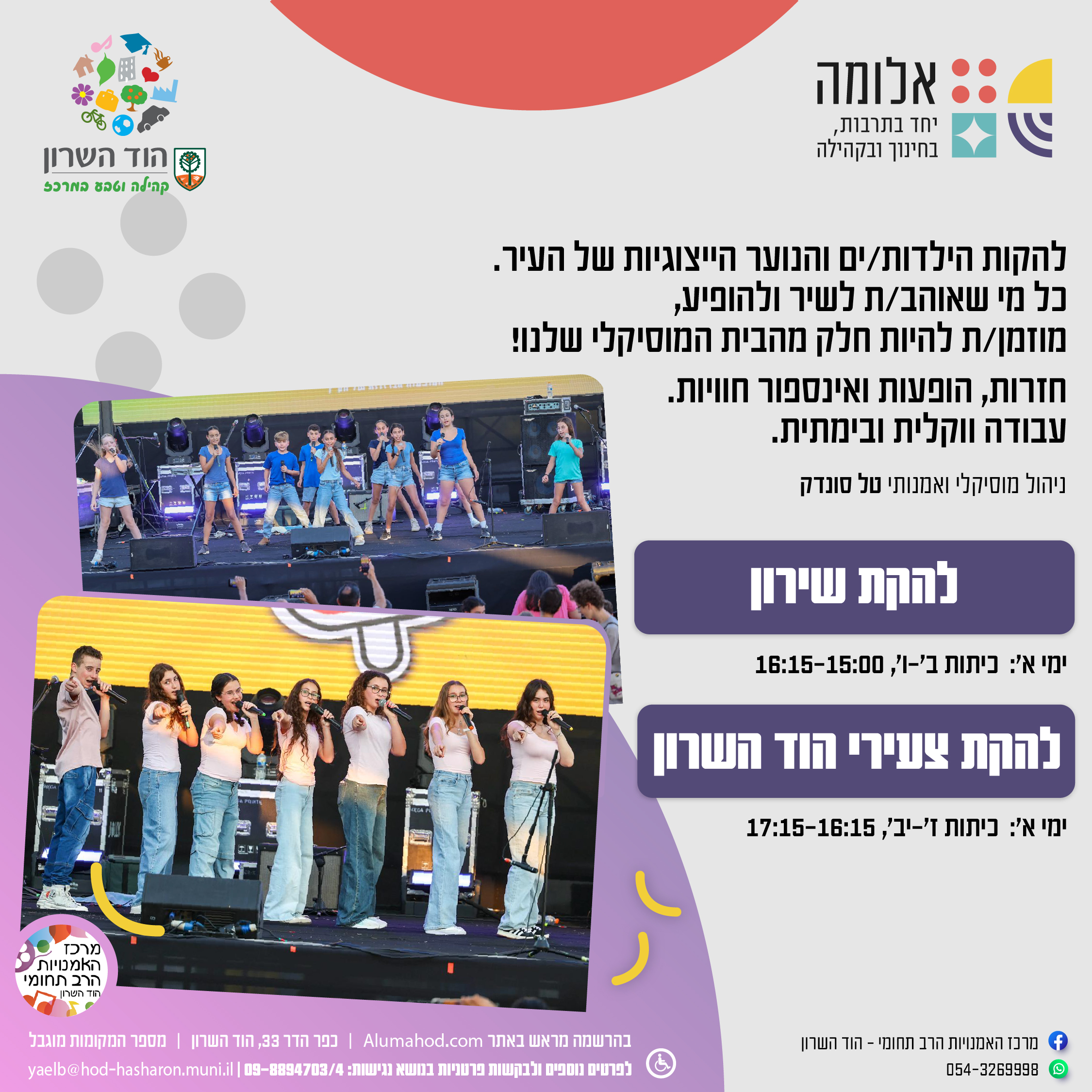 להקות הילדות/ים והנוער הייצוגיות של העיר.כל מי שאוהב/ת לשיר ולהופיע, מוזמו/ת להיות חלק מהבית המוסיקלי שלנו !