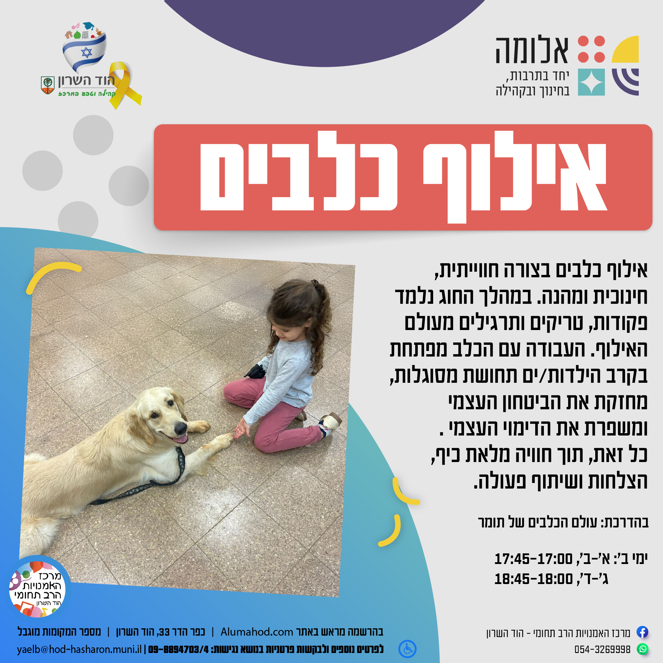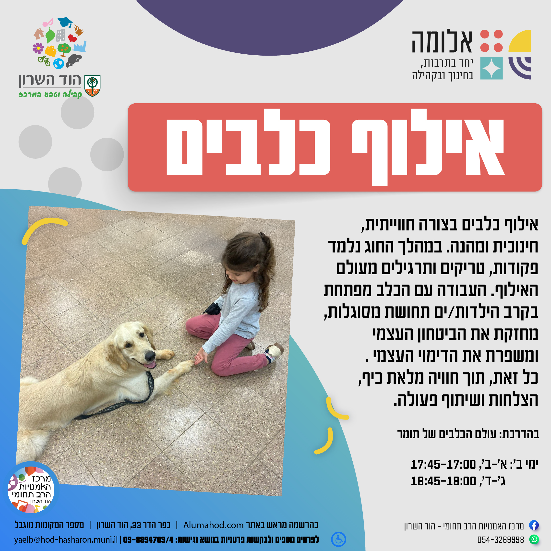 "חוג המיועד לילדות/ים ומעניק להן/ם הזדמנות מיוחדת ללמוד על אילוף כלבים בצורה חווייתית, חינוכית ומהנה.
