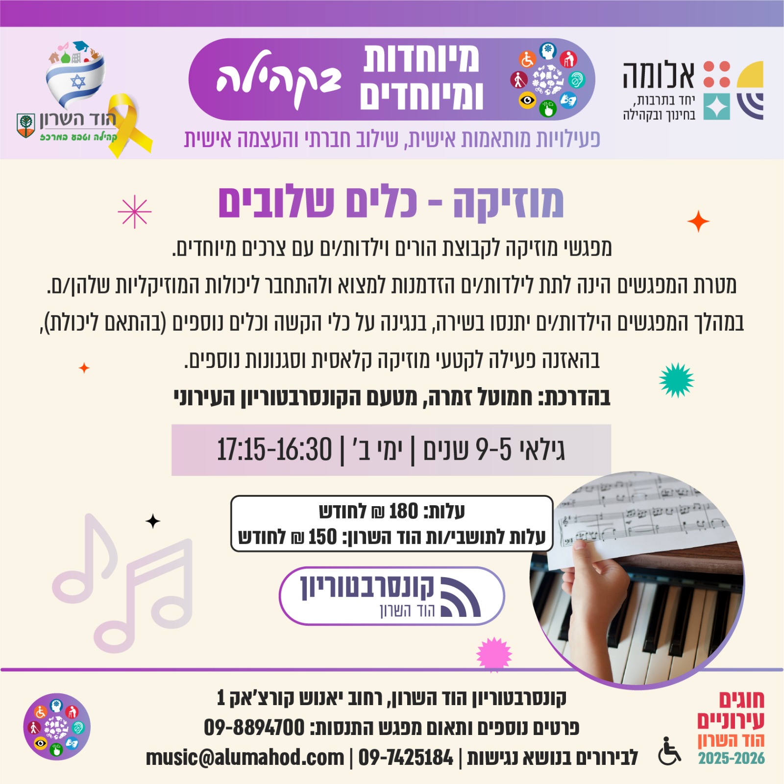 מפגשי מוזיקה לקבוצת הורים וילדות/ים עם צרכים מיוחדים. מטרת המפגשים הינה לתת לילדות/ים הזדמנות למצוא ולהתחבר ליכולות המוזיקליות שלהן/ם.
