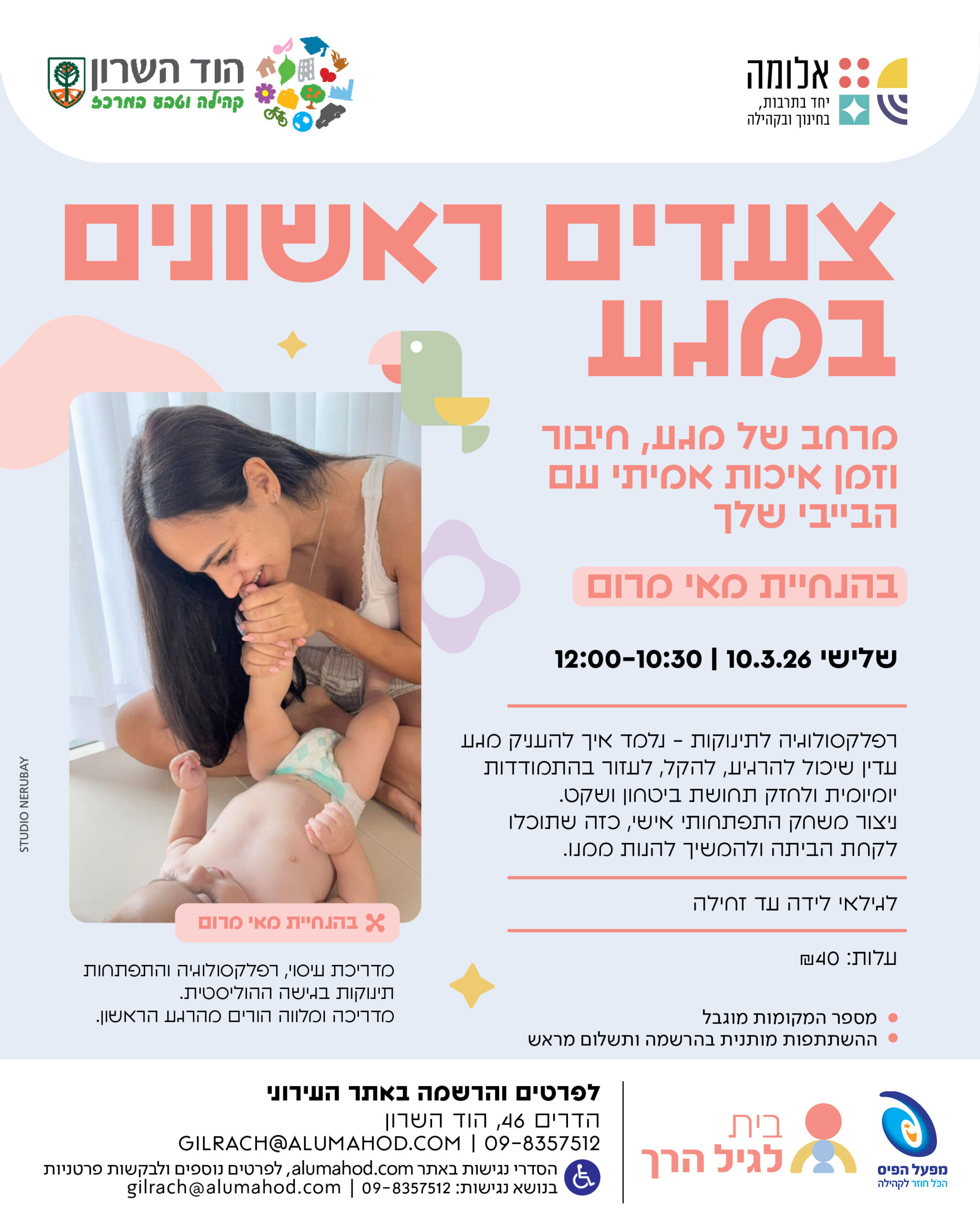 מרחב של מגע, חיבור וזמן איכות אמיתי עם הבייבי שלך.בהנחיית מאי מרום, מדריכת עיסוי, רפלקסולוגיה והתפתחות תינוקות בגישה הוליסטית. מדריכה ומלווה הורים מהרגע הראשון.