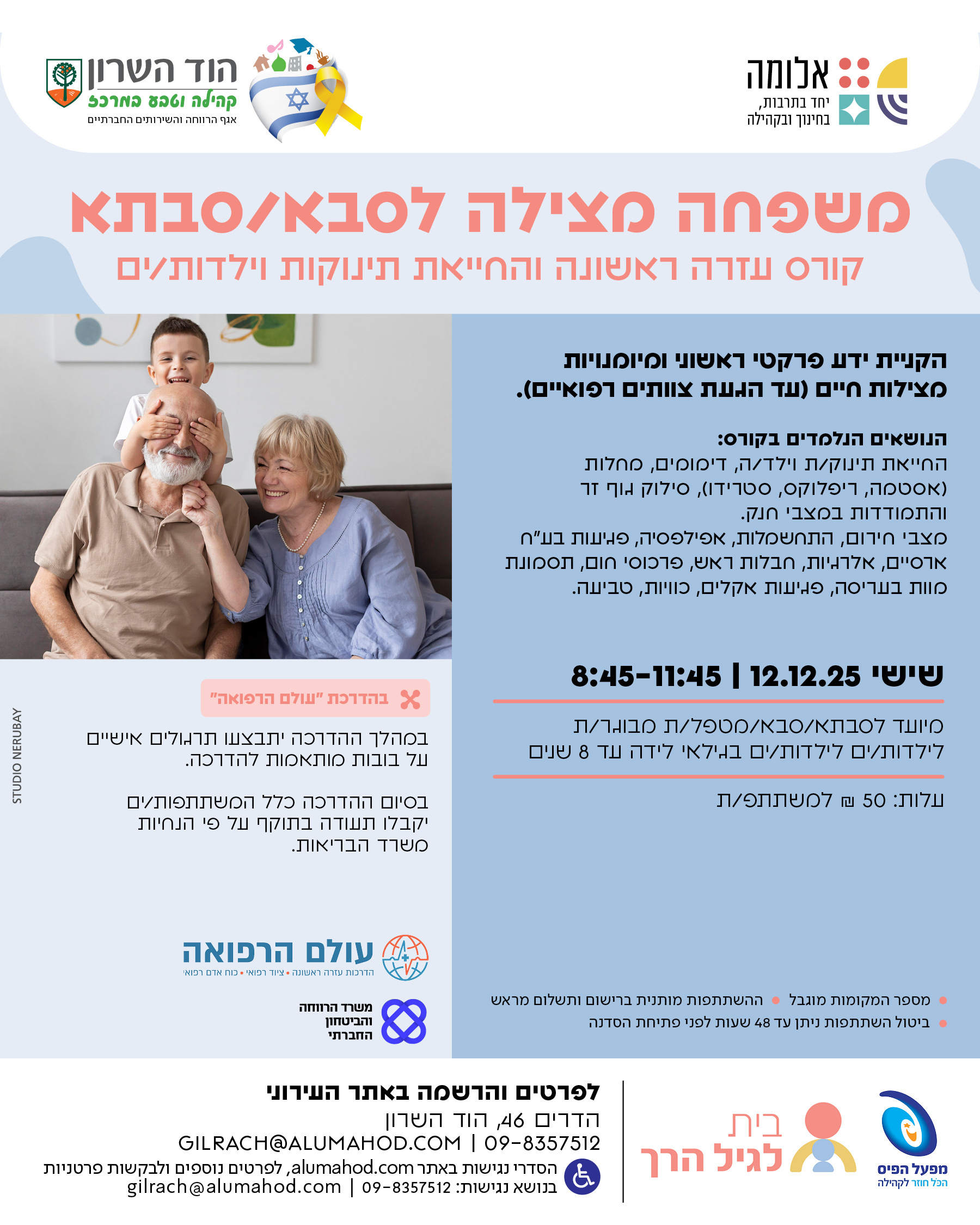 בהדרכת "עולם הרפואה"מיועד לסבתא / סבא / מטפל/ת מבוגר/ת לילדות/ים בגילאי לידה עד 8 שנים.