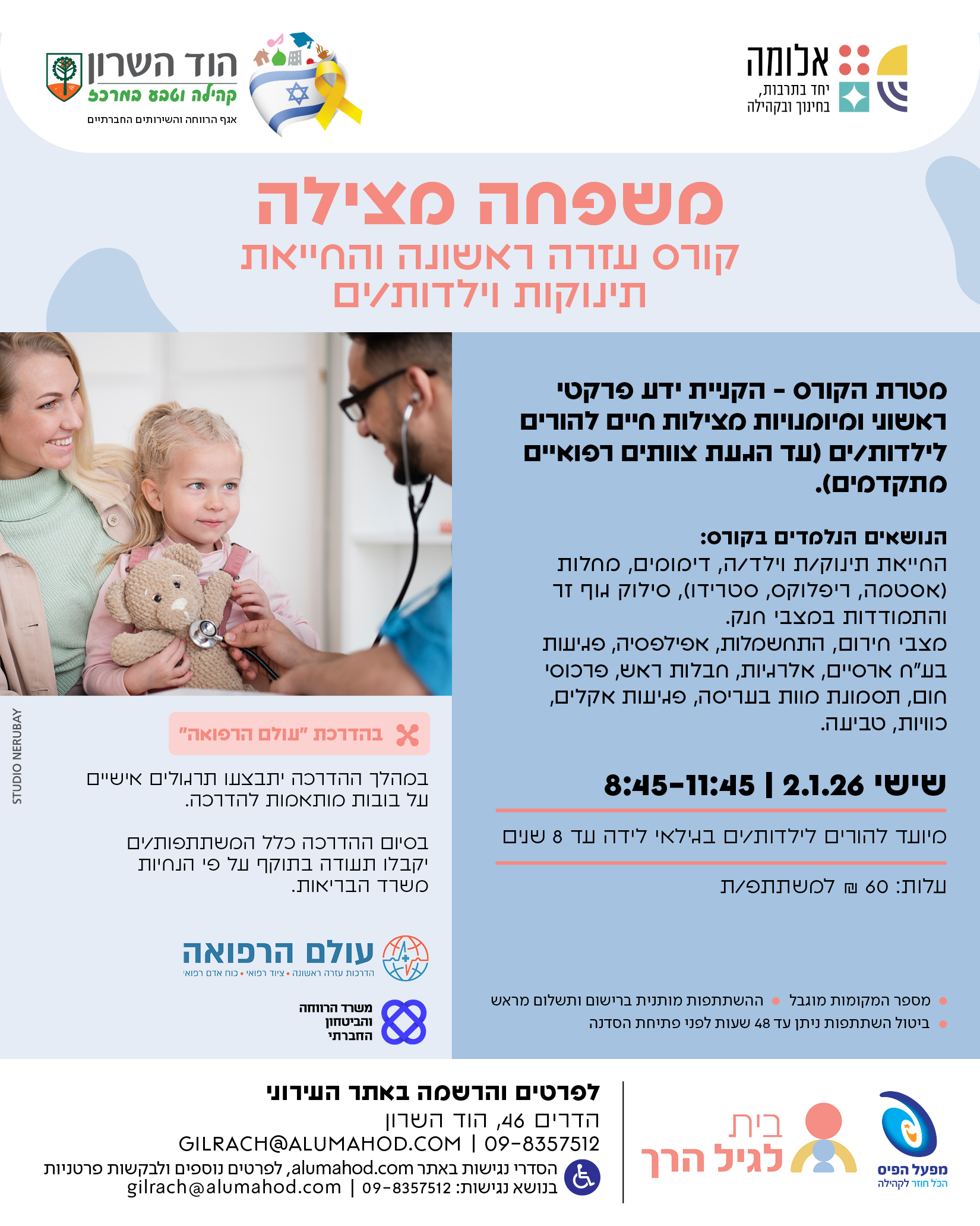 מטרת הקורס – הקניית ידע פרקטי ראשוני ומיומנויות מצילות חיים להורים לילדות/ים (עד הגעת צוותים רפואיים מתקדמים).