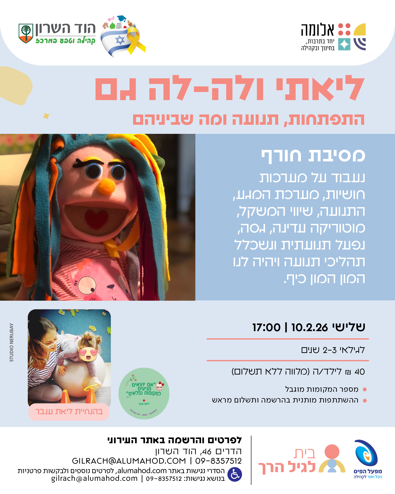 נעבוד על מערכות חושיות, מערכת המגע, התנועה שיווי המשקל, מוטוריקה עדינה, גסה, נפעל תנועתית ונשכלל תהליכי תנועה, ויהיה לנו המון המון כיף.
