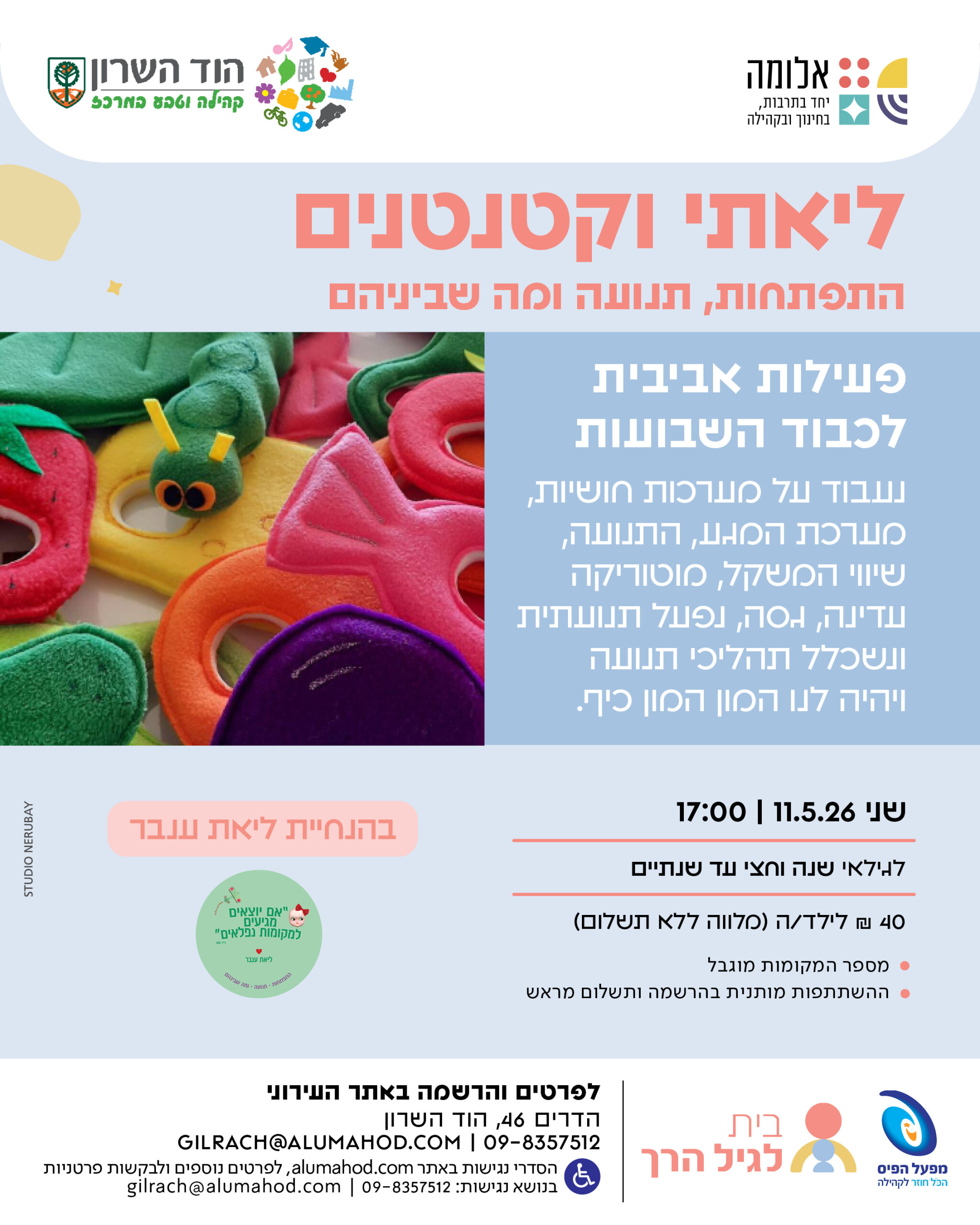 נעבוד על מערכות חושיות, מערכת המגע, התנועה שיווי המשקל, מוטוריקה עדינה, גסה, נפעל תנועתית ונשכלל תהליכי תנועה, ויהיה לנו המון המון כיף.