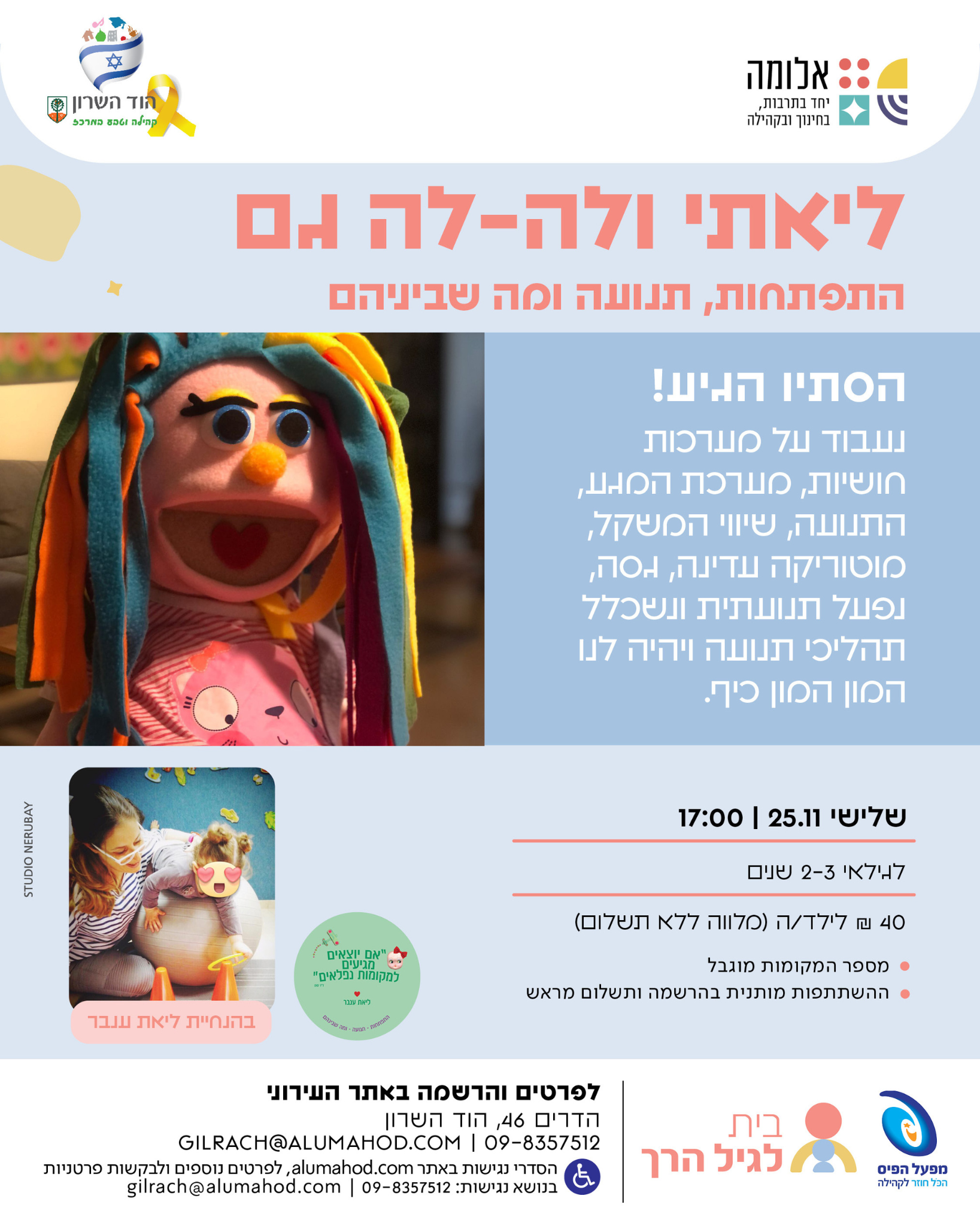 נעבוד על מערכות חושיות, מערכת המגע, התנועה שיווי המשקל, מוטוריקה עדינה, גסה, נפעל תנועתית ונשכלל תהליכי תנועה, ויהיה לנו המון המון כיף. -